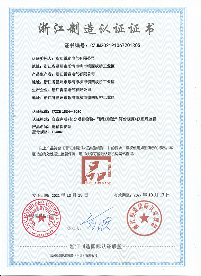 浙江雷泰電氣經(jīng)過3年時間的申請認(rèn)證及審核,成功榮獲該榮譽,獲得全國首張防雷行業(yè)的浙江制造認(rèn)證證書。這是浙江省品牌建設(shè)聯(lián)合會及社會以及市場對我公司的肯定。