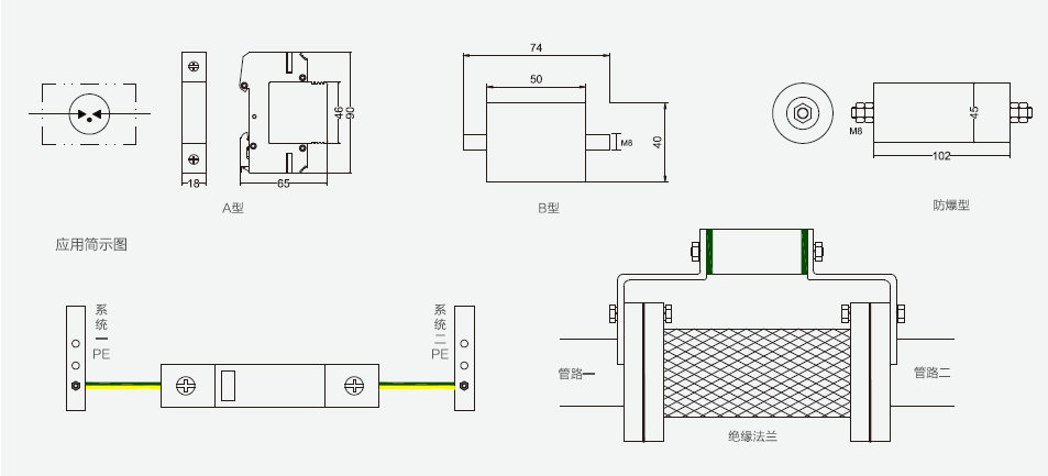 防爆型產(chǎn)品用在危險(xiǎn)區(qū)域不能直接互聯(lián)的系統(tǒng)部件,如會(huì)影響陰極腐蝕保護(hù)系統(tǒng)的絕緣盤、絕緣法蘭等管道部分的橋接,可安全應(yīng)用于防爆分區(qū)1或防爆分區(qū)2。