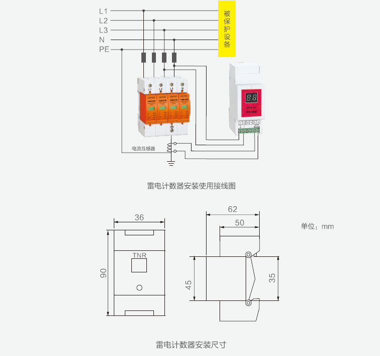 雷擊計(jì)數(shù)器配有電流互感器。安裝使用時(shí),把電流互感器套入電涌保護(hù)器的PE線上,互感器的次級(jí)線圈的兩根線引入雷擊流計(jì)數(shù)器的5、6接線柱,牢固連接,按下顯示開(kāi)關(guān),即可顯示記錄次數(shù)。